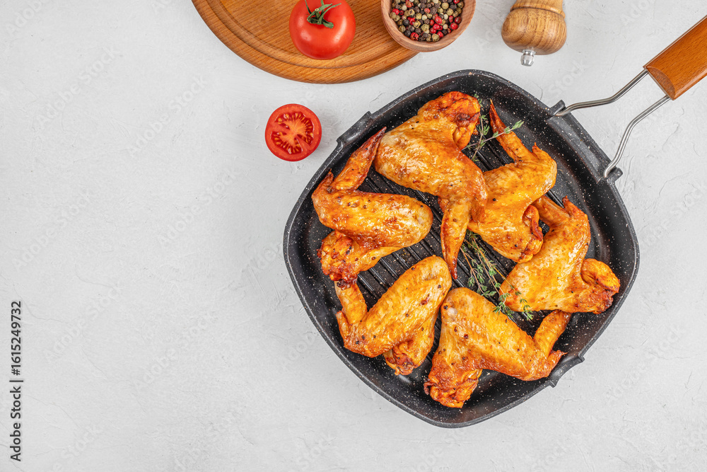 Crispy grilled chicken wings in a grill pan with herbs and spices, served on a light background with tomatoes and pepper mix. top view. copy space
