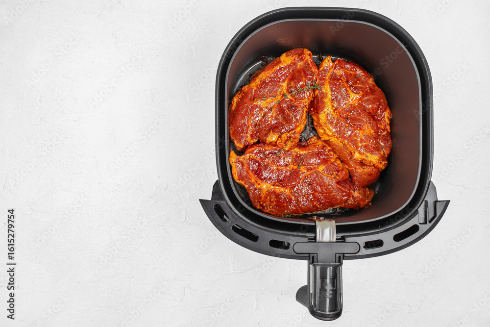 Top view of marinated pork steaks in an air fryer basket on a light surface with copy space