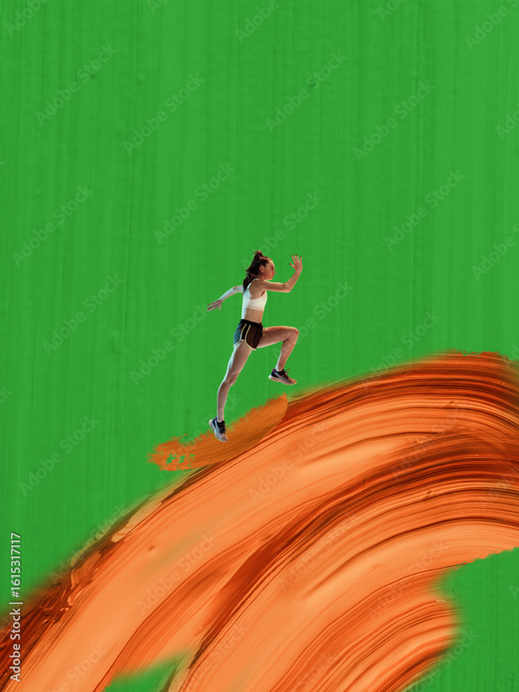 Contemporary collage of young female athlete climbing orange paint stroke on green background. Concept of personal growth, sports branding, motivational templates, youth fitness culture.
