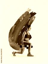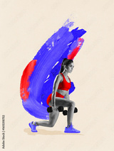Creative composition. Fit woman lunging with dumbbells over abstract red and blue brushstroke. Concept of home workout visuals, wellness coaching, fitness app UI, gym branding, strength training focus