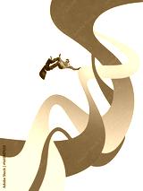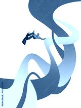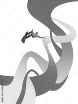 Creative collage of snowboarder flying above colorful curved ribbons on white background. Concept of winter sport poster, athlete energy promotion, fitness club advertising, motivational content.