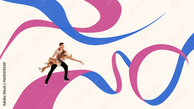Colorful composition of ice dancers in emotional pose on abstract pink and blue curves. Concept of winter sport movement, figure skating promotion, youth athletic expression.