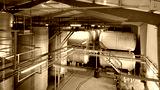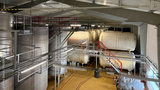 Industrial storage tanks and piping system in a modern manufacturing facility with spacious layout