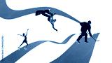Collage of figure skater, snowboarder, and hockey player in motion across violet path. Concept of winter sport variety, event branding, teamwork promotion, athletic emotion.