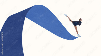 Collage of female figure skater balancing in arabesque pose on flowing blue ribbon. Concept of winter sport elegance, female athlete identity, expressive posture, graceful motion.