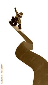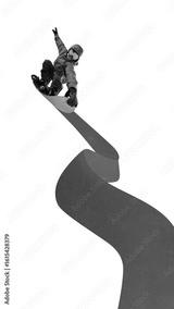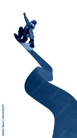 Creative digital artwork of snowboarder in blue outfit launching off edge on gradient ribbon trail. Concept of winter sport action, outdoor promotion, physical performance campaign.
