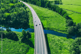 Aerial drone view of bridge asphalt road with hybrid and electric cars over blue river water and green summer field and woods