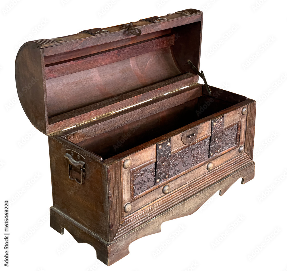 Antique wooden treasure chest open showing the inside, isolated on a white background