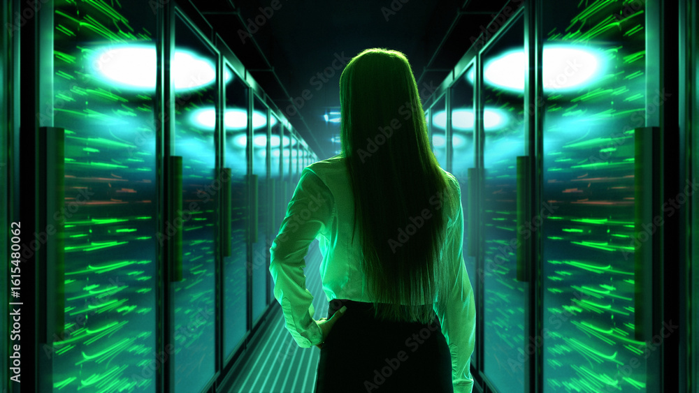 Woman in 3D data center corridor with glowing green servers. Concept of cybersecurity, corporate data access, IT infrastructure, enterprise intelligence, and cloud system control.