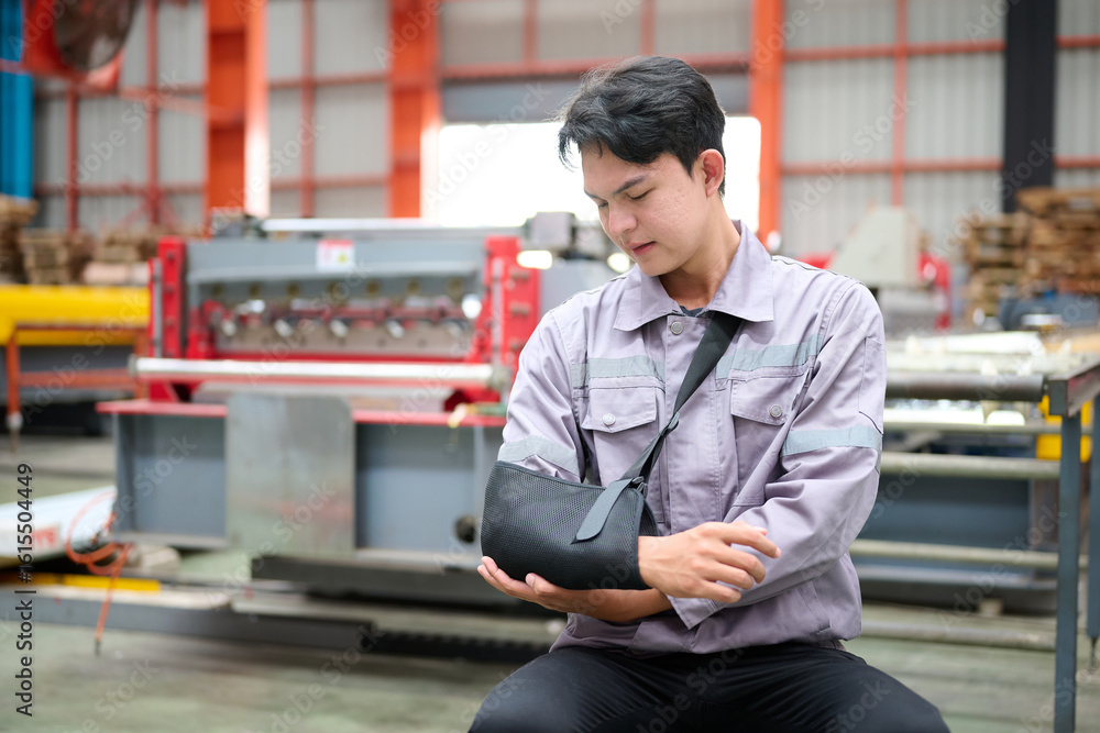Engineer or worker wearing bandages splint, pain in elbow and ache in arm from hard work in the factory