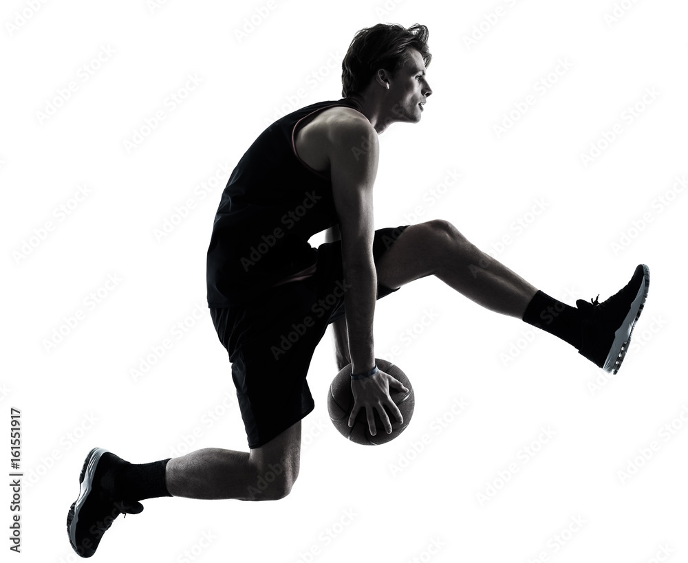 one caucasian basketball player man isolated in silhouette shadow on white background