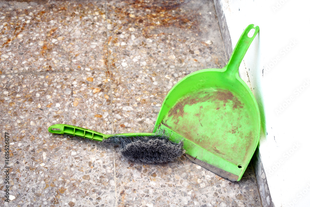 Dirty old dustpan and brush on the floor. Selective focus at the brush.