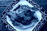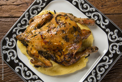 Little Chicken dish with polenta on wood background