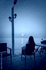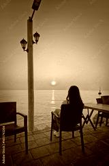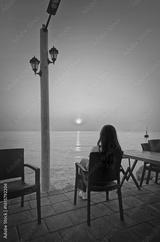Rear view relaxed young woman sits on the waterfront watching the sunrise over the sea in Kemer, Turkey. Peaceful ambiance seaside with female tourist silhouetted against the vibrant dawn