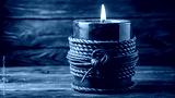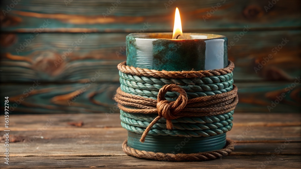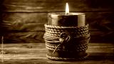 Photo of a lit candle in a decorative holder, wrapped with rope, sits on a rustic wooden surface