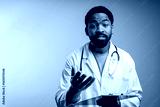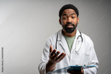 Confident black male doctor explaining therapy results to patient, holding clipboard, smiling, medical professional consultation