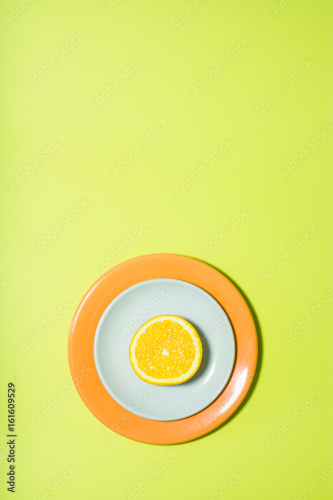 Orange slice on white and orange plate over lime green colored background. Vertical design for a leaflet, banner, cover or flyer design
