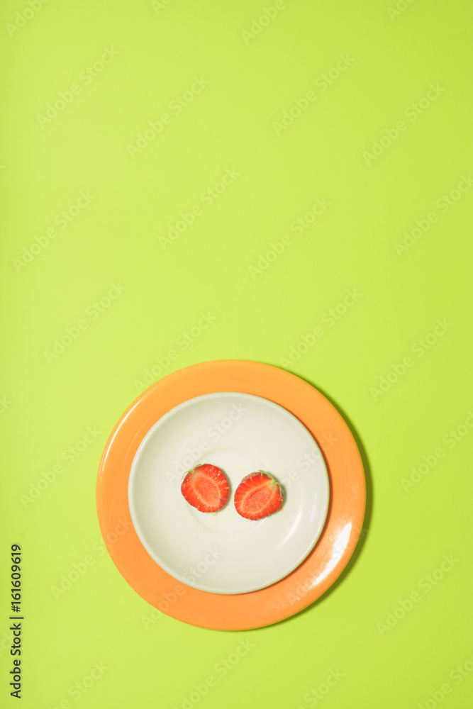 Strawberry slice on white and orange plate over lime green colored background. Vertical design for a leaflet, banner, cover or flyer design
