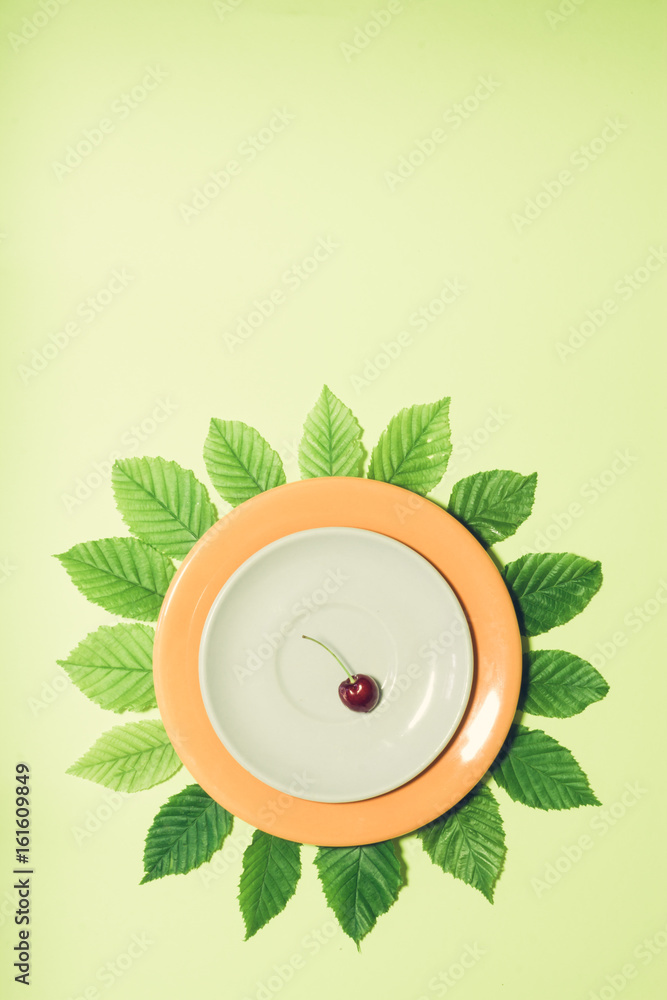 Minimal cherry background. Fruit on white and orange colored plate with leaves around it. Vertical design for a leaflet, banner, cover or flyer
