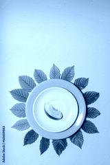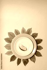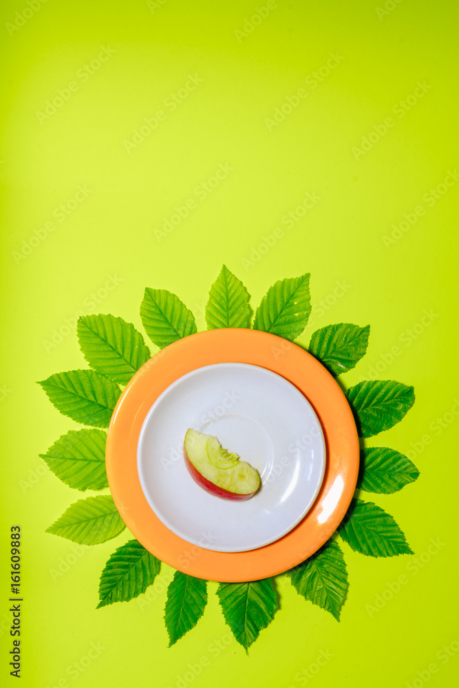 Apple slice on white and orange plate over leaves and lime green colored background. Vertical cover, banner, flyer, leaflet, page design