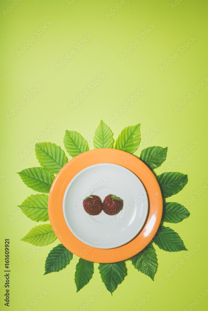Strawberry slice on white and orange plate over leaves and lime green colored background. Vertical design for a leaflet, banner, cover or flyer