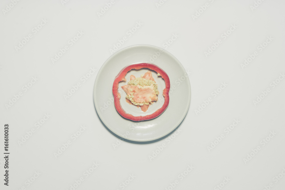 Minimal red pepper slice background. Fruit on white plate. Vertical design for a leaflet, banner, cover or flyer