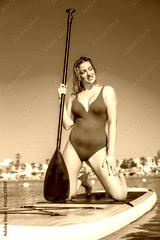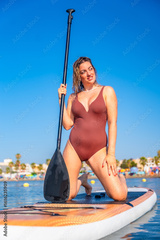 Young woman kneeling on paddle board enjoying summer vacation
