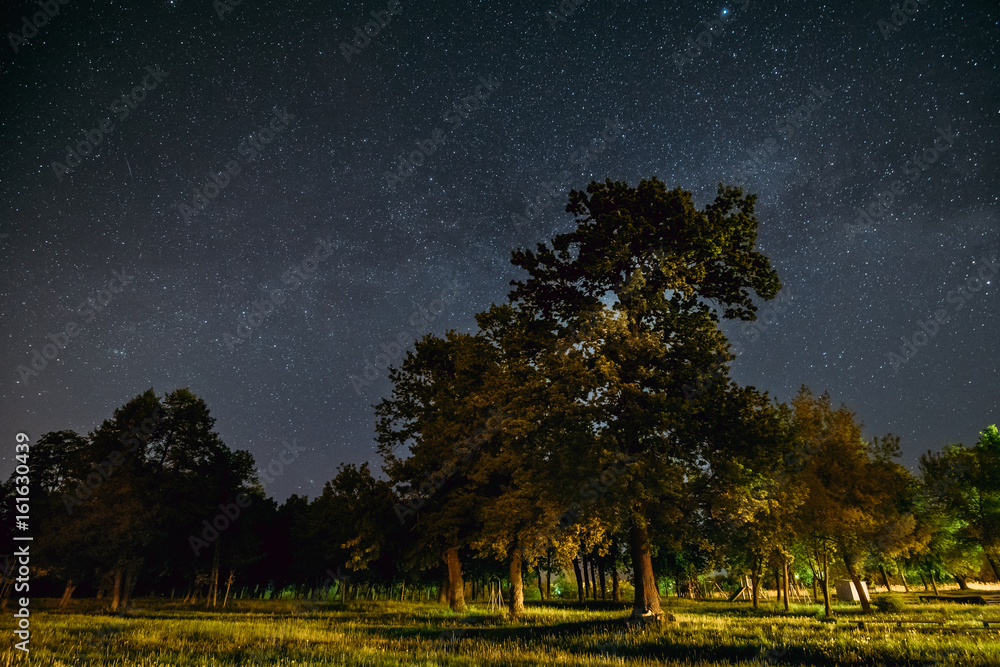 Green Trees Oak Woods In Park Under Night Starry Sky With Milky Way Galaxy