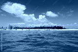 On a sunny day on a secluded beach on La Costa Island, next to Captiva Island in Florida. Crystal-clear water and a surreal landscape with dead tree trunks on land.