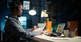 Financial advisor talks to his team on phone call at home office, obtain new business funding from shareholders. Young man doing remote work to increase revenue and reduce cost. Camera A.
