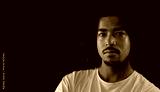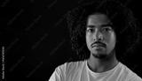 Studio portrait of a serious young african-american man with curly hair and goatee, wearing white t shirt, posing against a black background