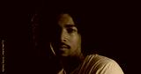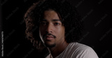 Portrait of a young african-american man with curly hair and goatee posing in a studio, illuminated by dramatic lighting against a dark backdrop
