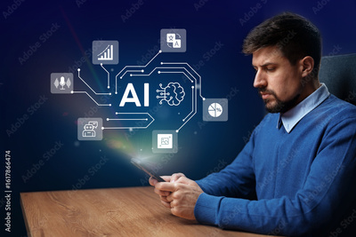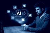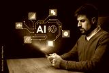Man using tablet to explore artificial intelligence concepts in a modern workspace