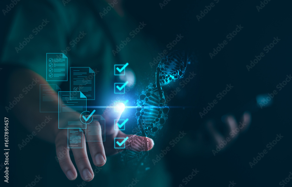 Medical research, doctor doing online checklist document, digital medical healthcare quality certificate, telemedicine