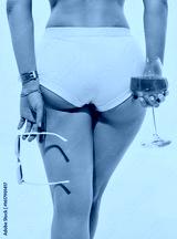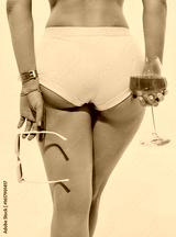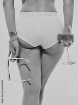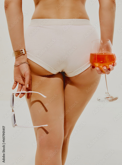 Close-up of back of woman in swimsuit holding cocktail and sunglasses walking in sunlight. Concept of summer fashion, beachwear branding, drink promotions, relaxed vacation lifestyle.