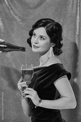 Smiling woman in velvet dress holding beer glass as bottle pours in front of golden curtain. Concept of elegant alcohol promotion, vintage glamour, female lifestyle, luxury drink branding.