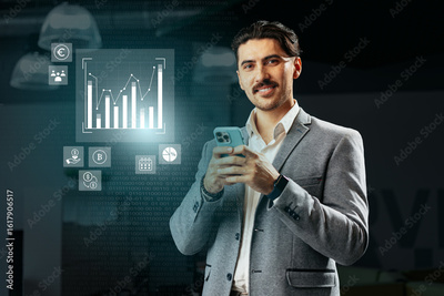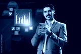 Professional man using smartphone with data analytics display in modern office environment during daytime hours