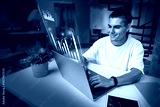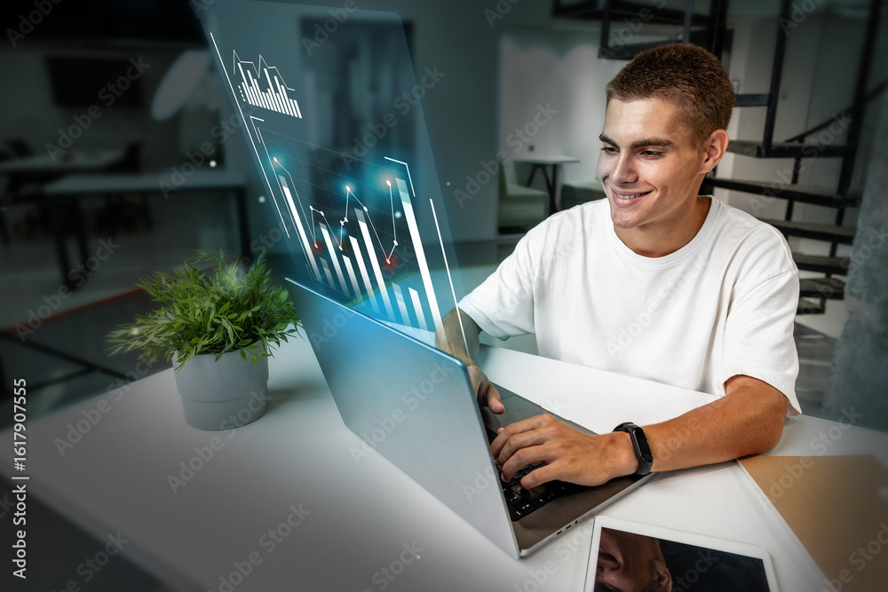 Young man working on laptop with digital graphs in modern workspace during daytime