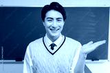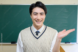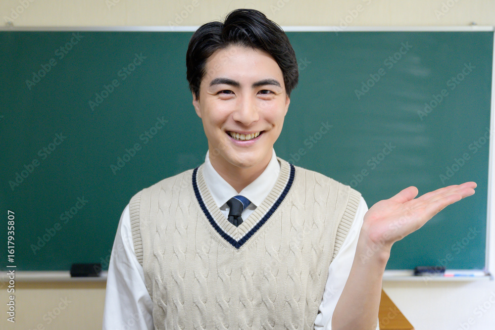 黒板の前で案内をする日本人男性