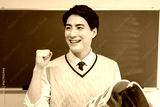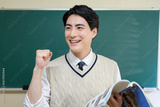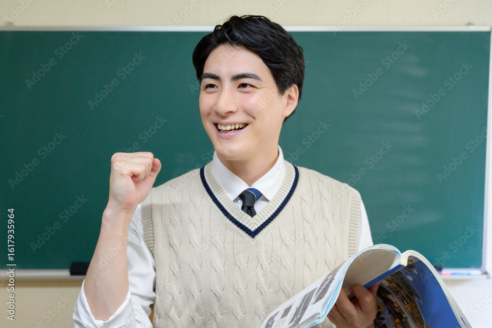 教科書を持ってガッツポーズをする日本人男性