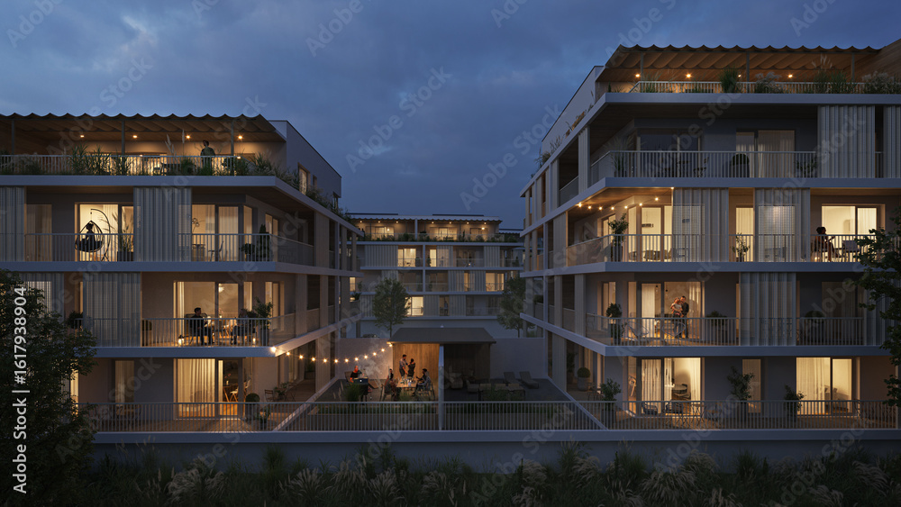 Modern Apartment Complex at Night with Cozy Balcony Lighting and Community Courtyard