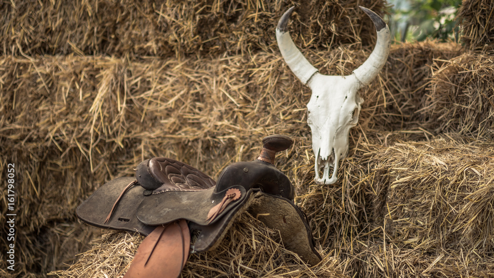Saddle Horse And Buffalo Skull On Straw Heap