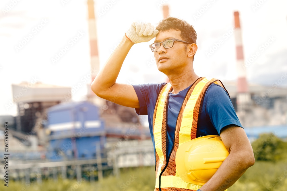 Tired worker, Hard working outdoor, Engineer male exhausted sweating work in UV heat environment