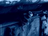 Close-up of an old locomotive and old carriages on a decommissioned railway, the paint cracked, peeled and rusted.