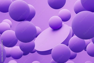 Abstract colorful violet balls with violet podium. Chaotic scatter spheres. Festive party wallpaper. 3d render creative background.