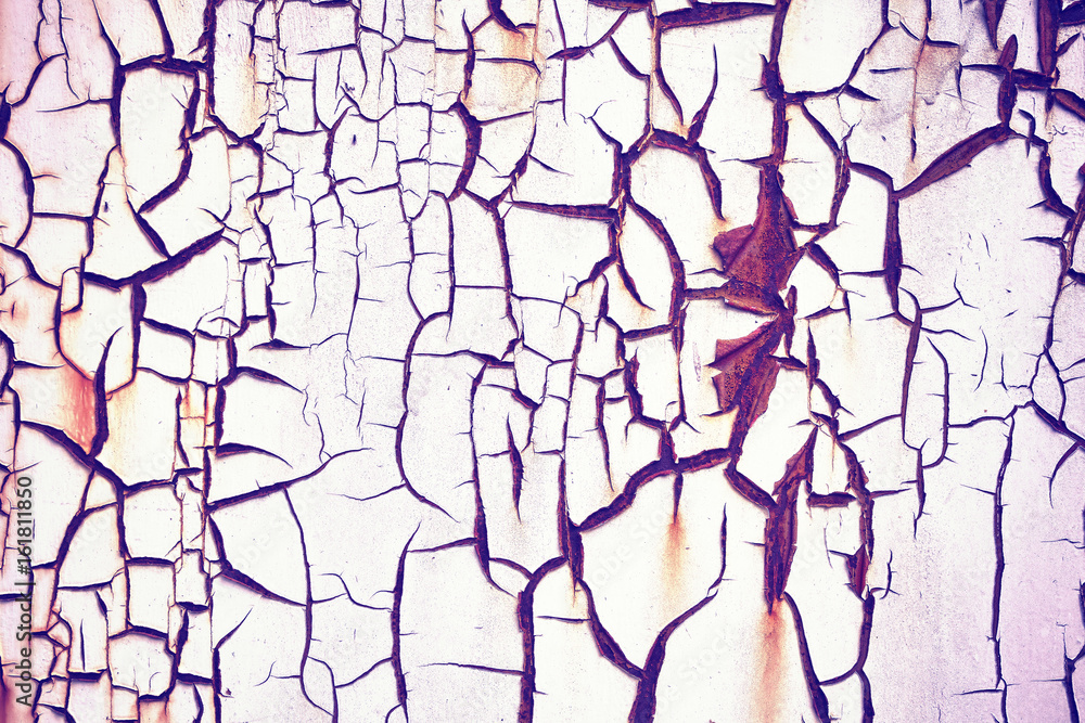 Color toned rusty metal wall with peeling white paint, grunge background or texture.