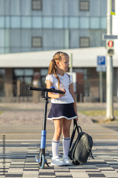Happy little girl holding backpack, stands near scooter in front of modern school building. Child riding a scooter in city. Active leisure and outdoor sport. Eco-friendly urban transport for kid.