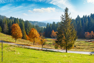 countryside mountain landscape of ukraine in autumn. rural road winding through valley among field and trees on the hill in orange foliage. scenic vista in fall season for travel and outdoor adventure