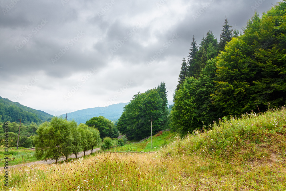 countryside landscape with overcast sky in summer. forest on the grassy hill. cloudy weather forecast. remote rural scenery in carpathian mountains