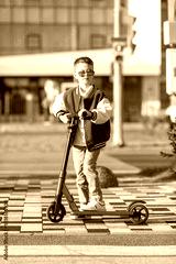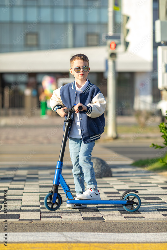 Stylish little boy with backpack, stands near scooter in front of modern school building. Child riding a scooter in city. Active leisure and outdoor sport. Eco-friendly urban transport for kid.